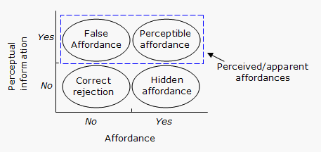 Gaver는 Affordance와 지각정보의 유무를 바탕으로 영역을 나눴다. Gaver의 논문 Technology Affordances에서 어포던스는 지각의 유무와 상관없이 존재 하는데 이는 그것들이 지각되어야만하는 고유한 속성을 가지고 있다고 설명한다.