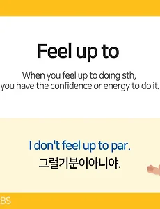 English1 Lesson 2. pharasal verbs Feel up to : When you feel up to doing sth, you have the confidence or energy to do it.ex) I wanna dancing, Do you feel up to it with me?나 춤추고 싶어, 너도 나와 ? Do we have to go to the party? I really don't feel up to it.우리 그 파티 가야해? 난 그럴기분이 아냐. I don't feel up to par. 그럴 기분이 아냐. Do you feel up to talking about it? 그것에 대해 얘기해도 괜찮겠어? I don't feel up to it. 그걸 해낼 수 있을 것 같진 않는데요. I don't feel up to it no.. 2018. 11. 5. 이전 1 다음